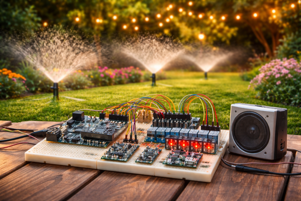 One of our recent client projects was a Smart Garden Automation with Arduino and Audio Playback system designed to automate multiple outdoor functions in a scheduled and coordinated way. The goal of this project was to create a dependable embedded control system capable of managing garden lights, 10 water sprinkler lines, and a music playback system according to programmed time intervals. The system was designed as a 24-hour clock-based automation solution for an apartment-complex-style environment, with accurate timekeeping and flexible future expansion in mind.