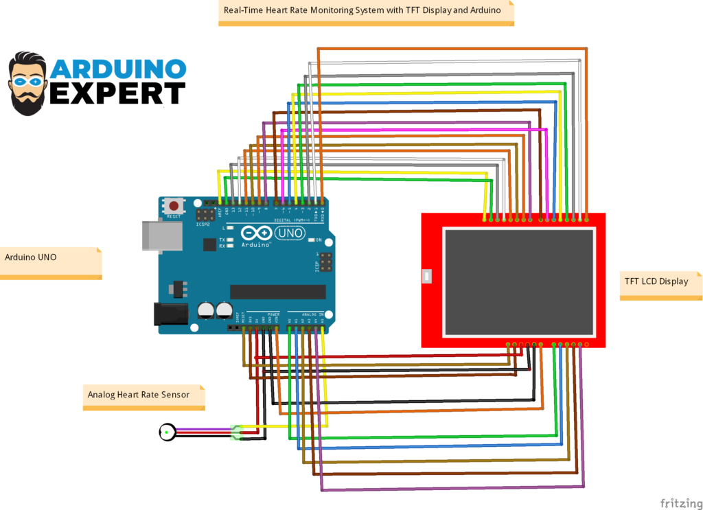 Circuit Diagram of Arduino with TFT LCD and Analog Heart Rate Sensor