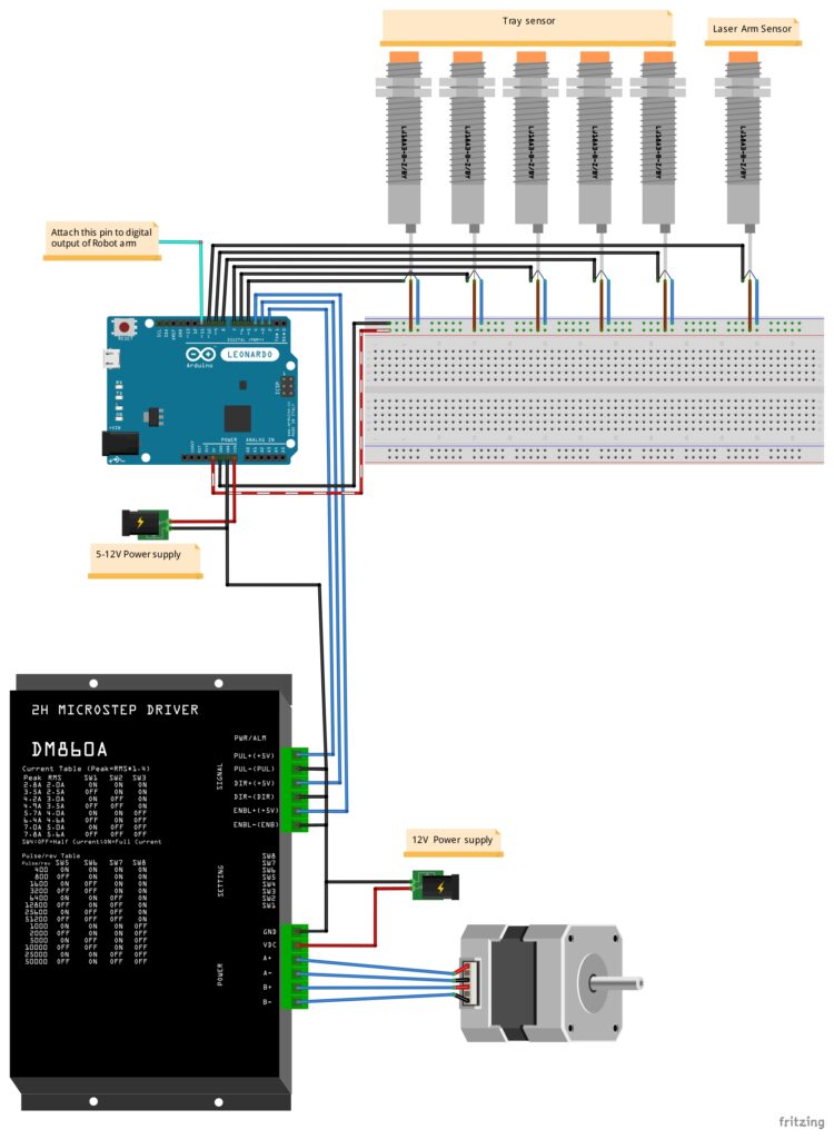 Circuit Diagram of Arduino Leonardo with Inductive Proximity Sensor, Robot Arm and Stepper Motor Driver (DM860A)